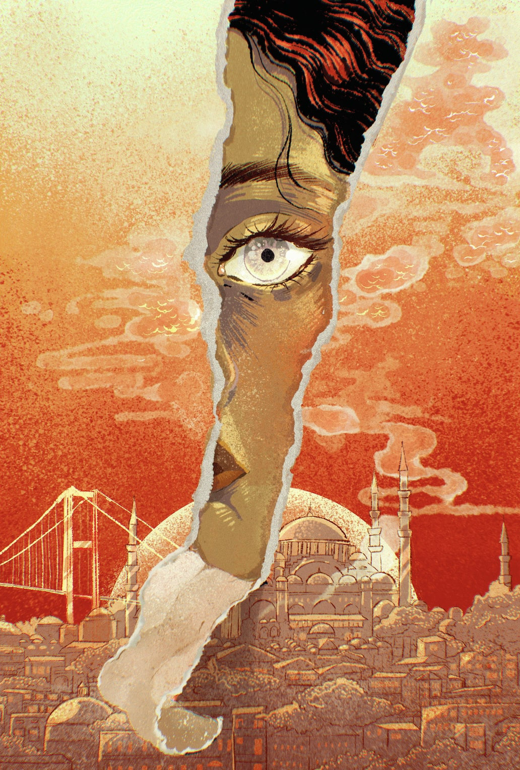 I play with symbolisms such Tequila Leila's dream to be a blue betta fish in the ocean, sunrise (a new tomorrow), the red light of the brothel, Turkish ornaments... The story is set in Istanbul, the fragmented, strange, contradictory city which Shafak writes as if it was a protagonist with a life of its own. I felt it was important that this city was conveyed one way or another through ornaments or the actual skyline (with the Bosphorus Bridge that played a huge part in the story).