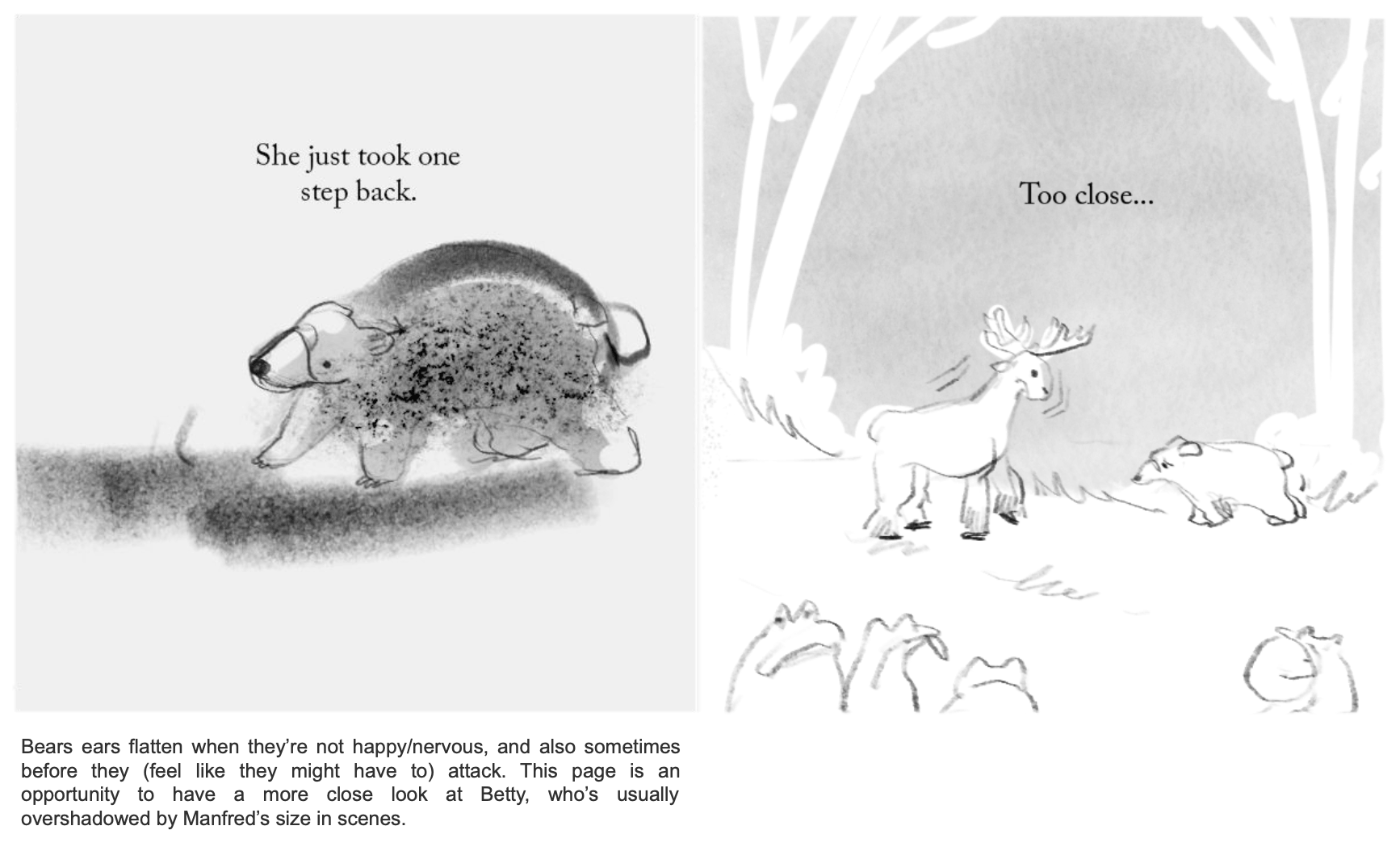 Serif fonts. Ink wash and grainy textures yet not gray or dark. Realistic animals, avoiding cutesy characters. These all make a more elegant, serious, and contemplative picture book.